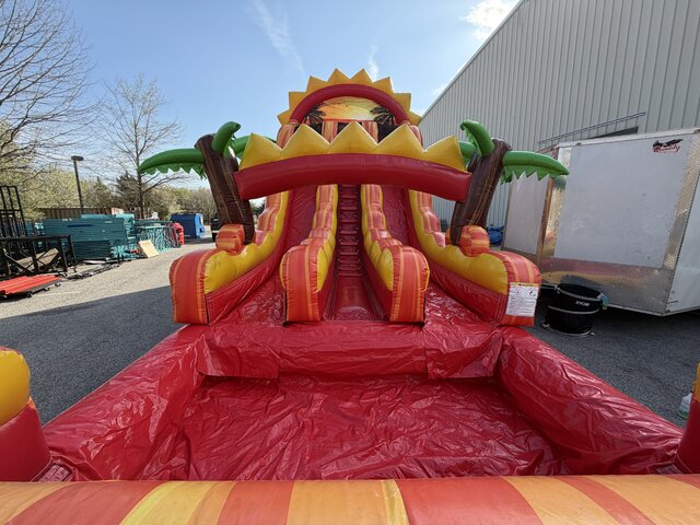 DescriptionThe 18ft Summer Sunrise Dual Lane Slide will pop at your next party. These vibrant colors will have you guess in a good mood.