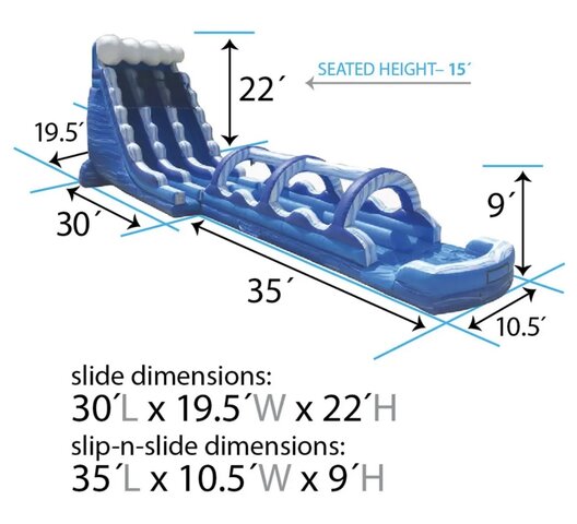 22ft high and 60ft long Tidal Dual Lane Curve Slide will be the non stop attraction at your party. I can promise the kids and maybe adults will sleep so good the night after your party from having so much fun.