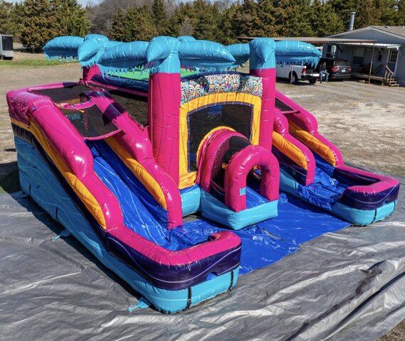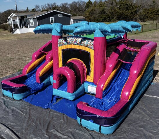 The Tiki 2 Slide Combo might be for the smaller kids but this is a whole vibe for your get together. This unit can be used wet or dry.